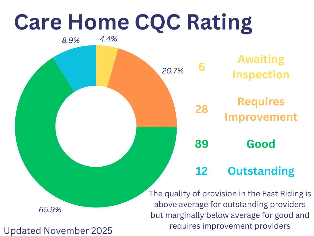 In April 2020 the average occupancy across all care homes in East Riding was 93%.  This reduced to 83% by April 2021 and showed a limited recovery by April 2022 to 86%. As of January 2025, the average occupancy is 89% across all care homes in the East Riding.